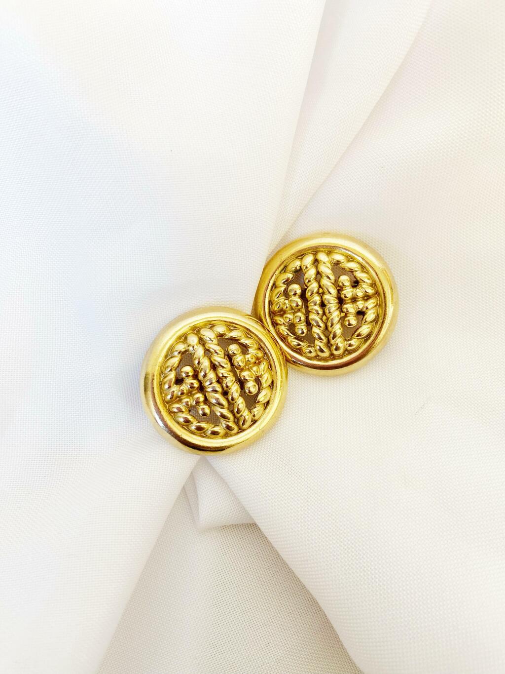 Este brinco vintage dourado é a peça perfeita para quem busca sofisticação e charme clássico. Com um design redondo e detalhamento texturizado, ele evoca um estilo refinado e atemporal, ideal para compor looks elegantes e marcantes.