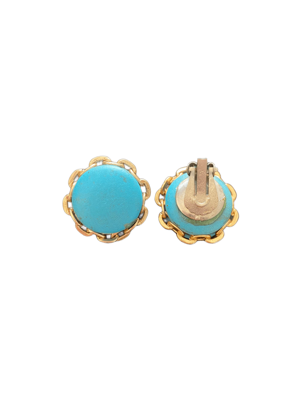 Este brinco vintage apresenta um elegante design redondo com pedra em tom turquesa intenso, envolta por uma moldura metálica dourada com acabamento ondulado, que confere um toque feminino e retrô à peça. Com fecho de pressão (clip), é ideal para quem busca conforto sem a necessidade de perfuração.