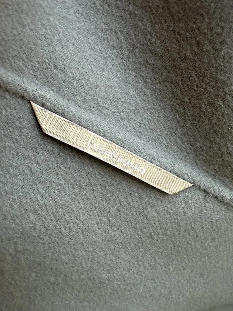 Este casaco traz a etiqueta “Cucito a mano” (“costurado à mão”), o que indica acabamento manual de alta qualidade.