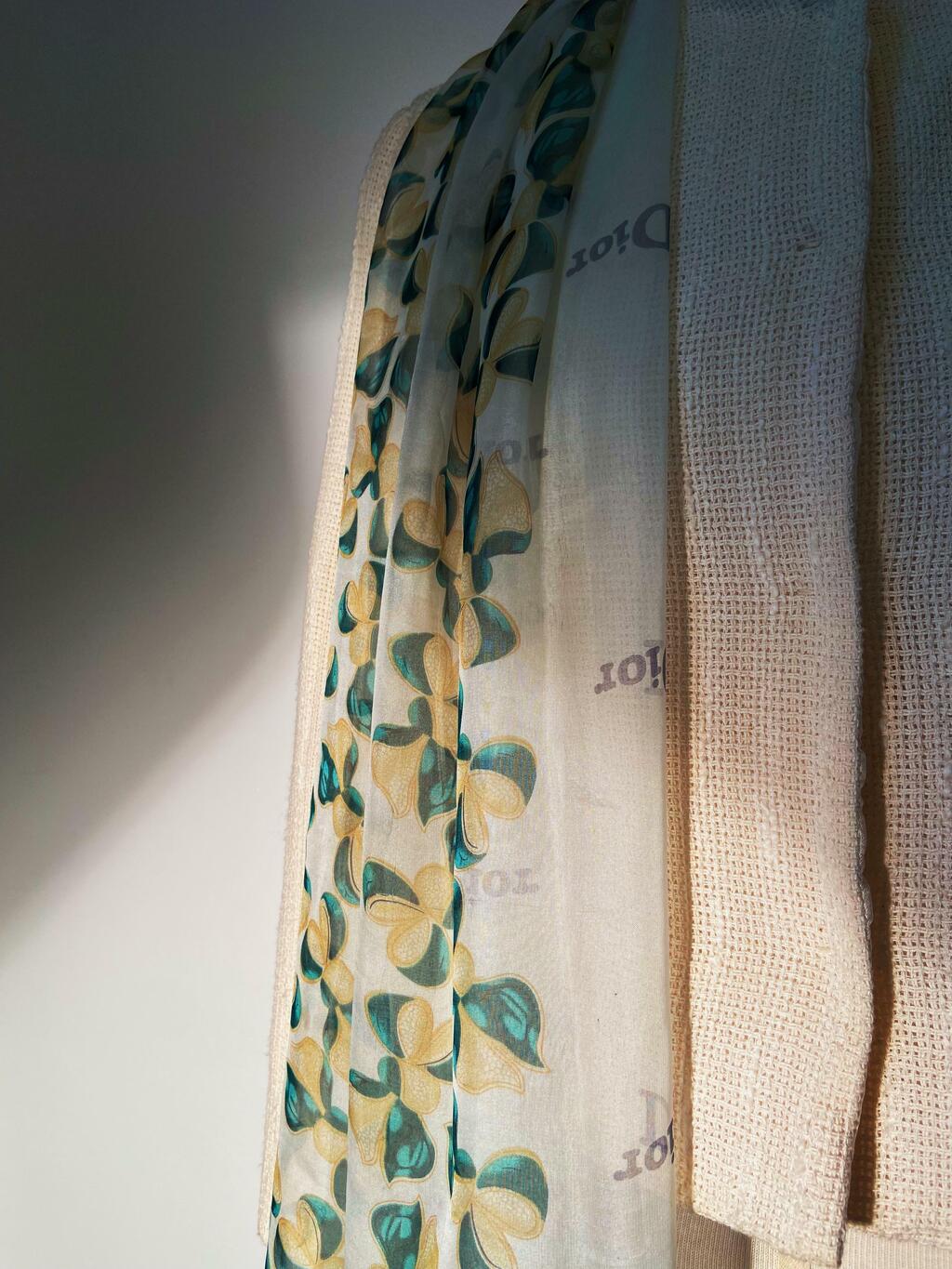 Elegância atemporal e sofisticação definem este lenço Dior em seda pura. Com um toque suave e acabamento refinado, a peça apresenta o logo “Dior” estampado em padrão contínuo no centro, emoldurado por uma delicada borda floral com folhas em tons de verde e bege, que adicionam um charme sutil e clássico.
